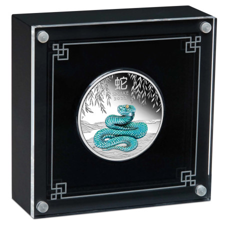 Detailní vyobrazení stočeného hada, v nádherné proměnlivé tyrkysové barvě. Minci doplňuje nápis SNAKE 2025 a značka Australské mincovny P. Krásně ropracované kontrasty mezi matným a lesklým povrchem v provedení proof.