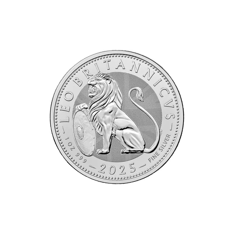 Britský lev s bojovým štítem a nápisem LEO BRITANNICVS, hmotnost, ryzost a rok ražby 2025