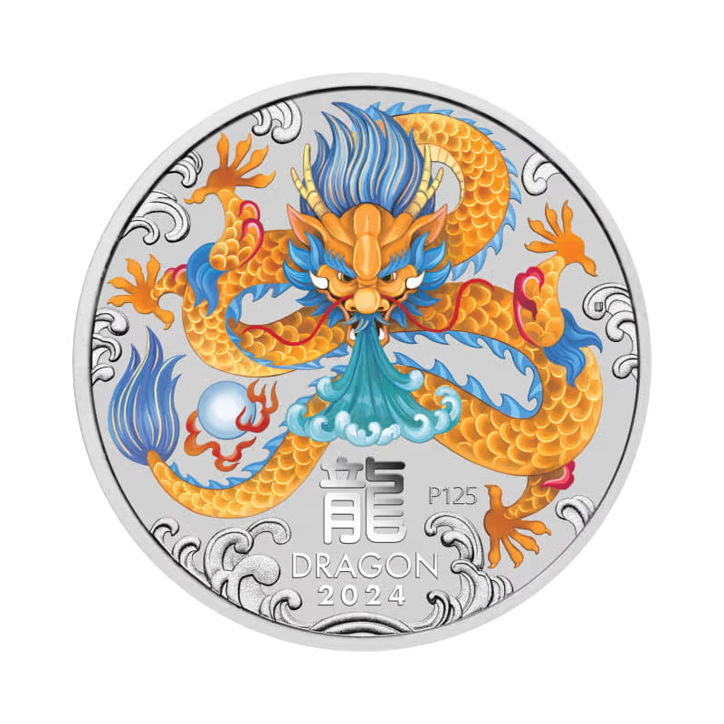 Stříbrná kolorovaná mince z australské Lunární série III – Rok draka 2024. Série vychází z čínského lunárního kalendáře a každoročně přináší nové ztvárnění zvířete daného roku. Mince je ražena z dvou uncí ryzího stříbra (999,9/1000) prestižní mincovnou Perth Mint. Výrazný barevný motiv draka symbolizuje sílu, štěstí a ochranu, což z této emise činí výjimečný sběratelský kus.